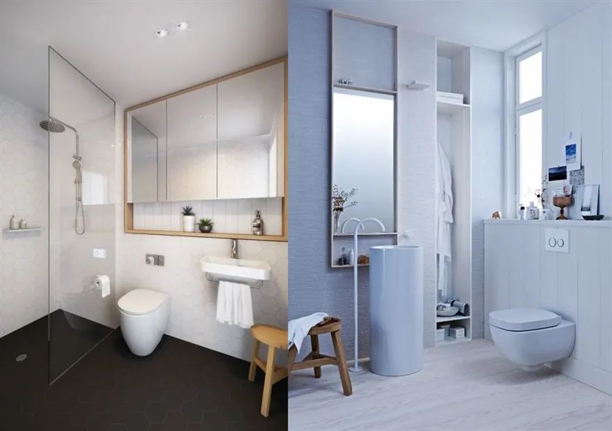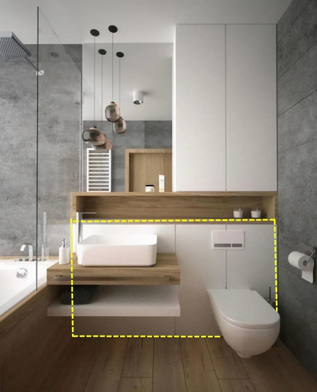 现在更多人青睐壁挂悬空马桶,除了嵌入非承重墙,其实可以砌筑假墙来实现,这里同样可以嵌入矮柜,增加卫生间收纳力。