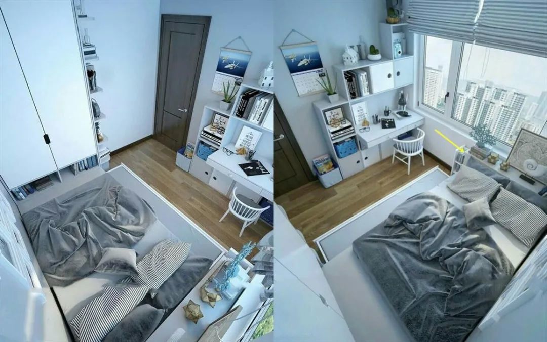 这里选择在床头靠窗基础上加一字型矮柜,这样正好将床头与窗户直接拉开了距离,开合不受影响,加上矮柜台面的过渡,溅水影响的机率也大大降低了。