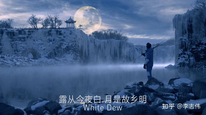 白露画面的诗句"露从今夜白,月是故乡明"就是类似想法的表现。“我们去哈尔滨原本是想去到一个封冻的湖面去拍,但是去采景的过程中,有一个意外的收获就是,我们那天赶上黑龙江历史最低温的一天,白天零下40度。刚好有一个封冻的瀑布,但是冰瀑布下面的水是在冒烟,真的像仙境一样,瞬间就觉得这个地方怎么可以这么漂亮。”