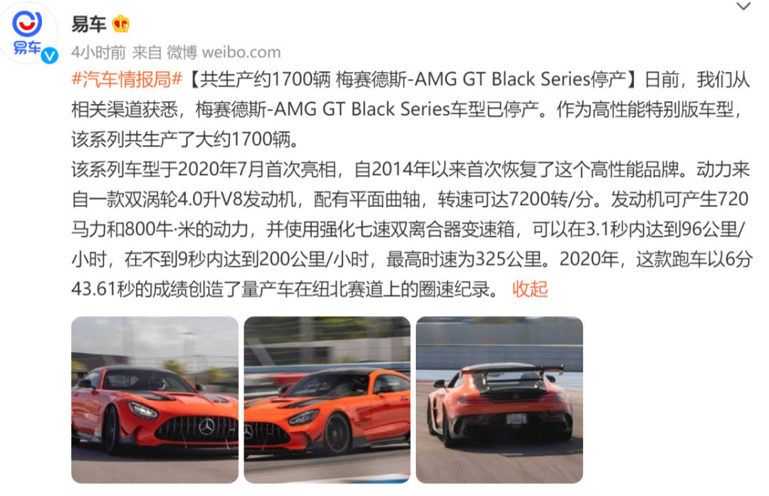 近日,有媒体报道,梅赛德斯-AMG GT Black Series车型已停产。
