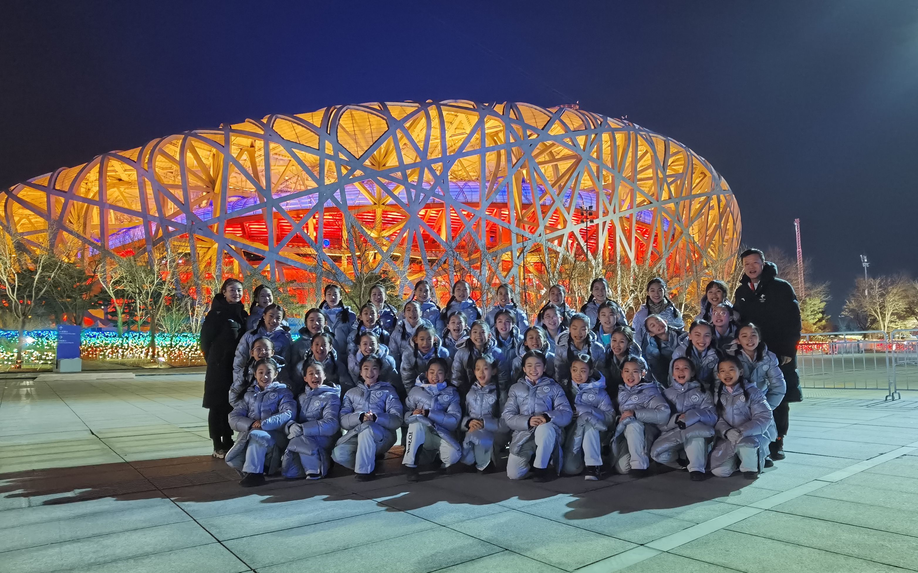 实验二小金帆舞蹈团在鸟巢前合影。 图/实验二小供图