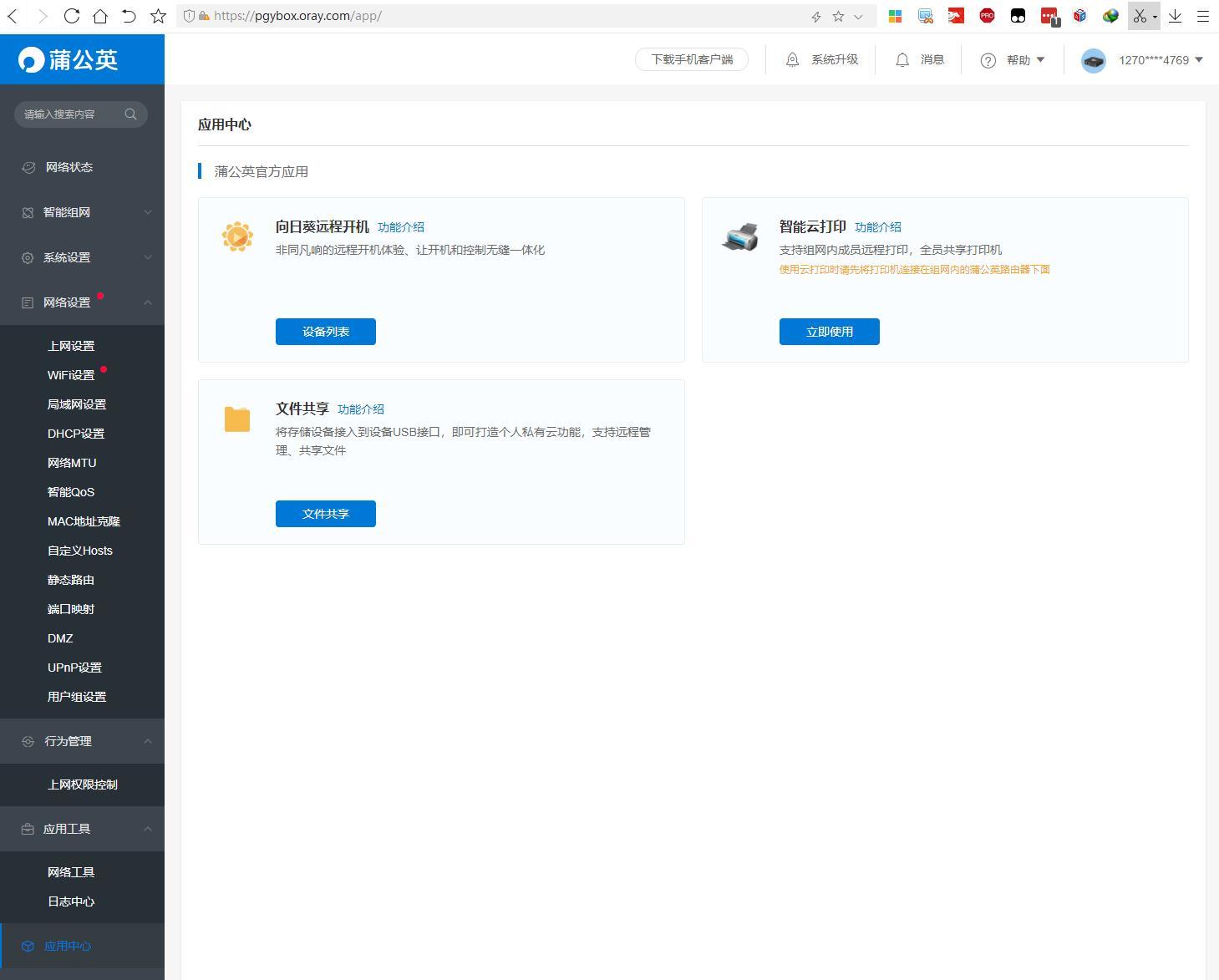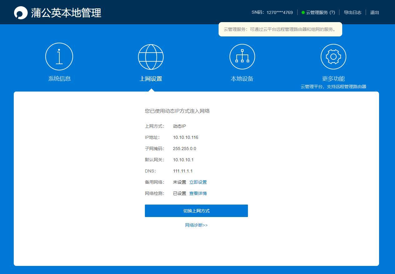 注意,通过主路由查看蒲公英X1的IP地址,然后通过IP进入的界面是本地管理,用来设置上网方式和WiFi名称的,基本上来说,这个用处不大(可以在绑定手机APP后直接管理);最重要的就是后面那个更多功能,即路由器背面的网址pgybox.oray那个: