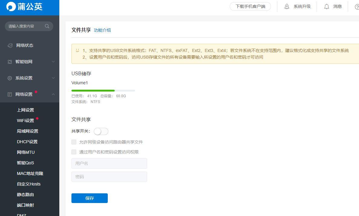 打开文件共享功能开关,默认是关闭的。如果勾选上“允许同级设备访问路由器共享文件”后会红字提示“不建议在公网上开启此功能”,我是家庭网络而且为了演示就勾选了,如果在酒店/宾馆/单位,请注意隐私防护。