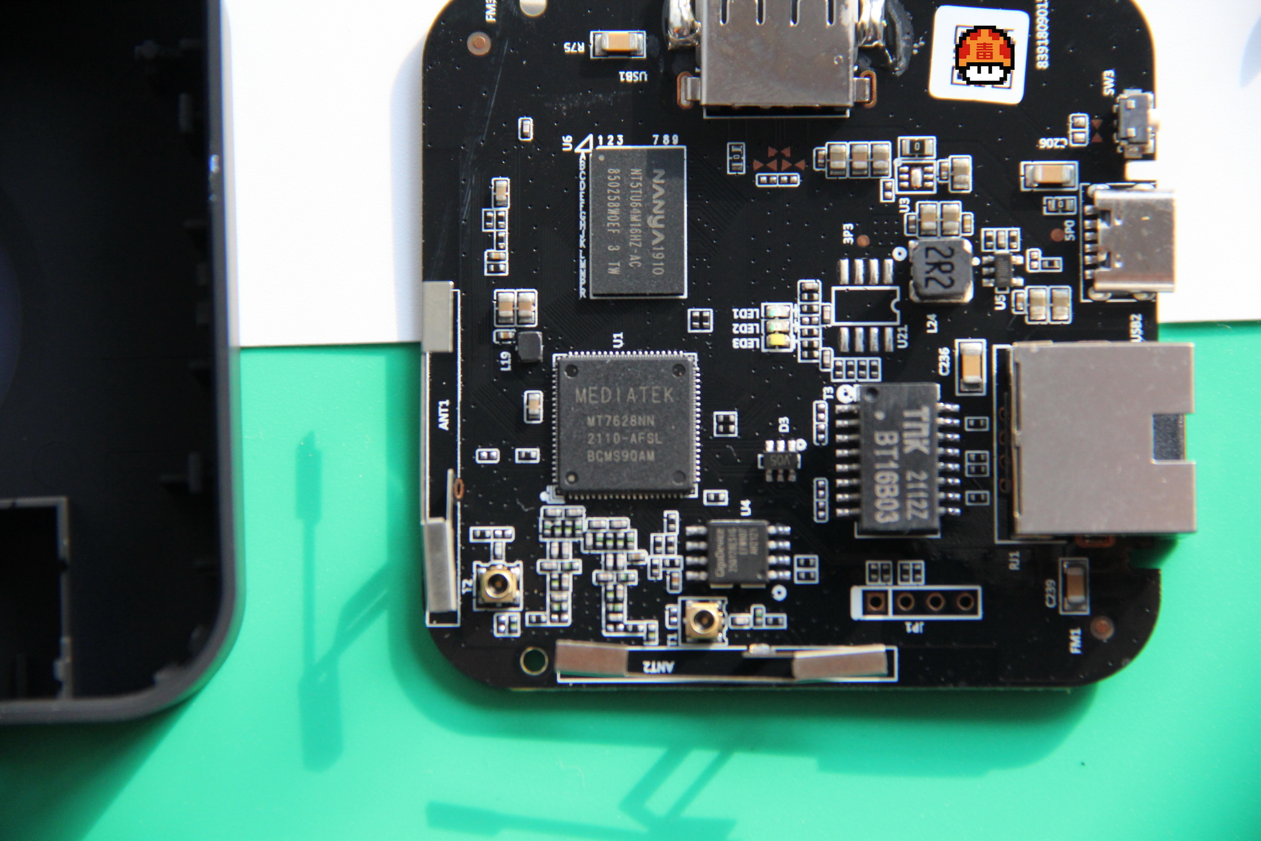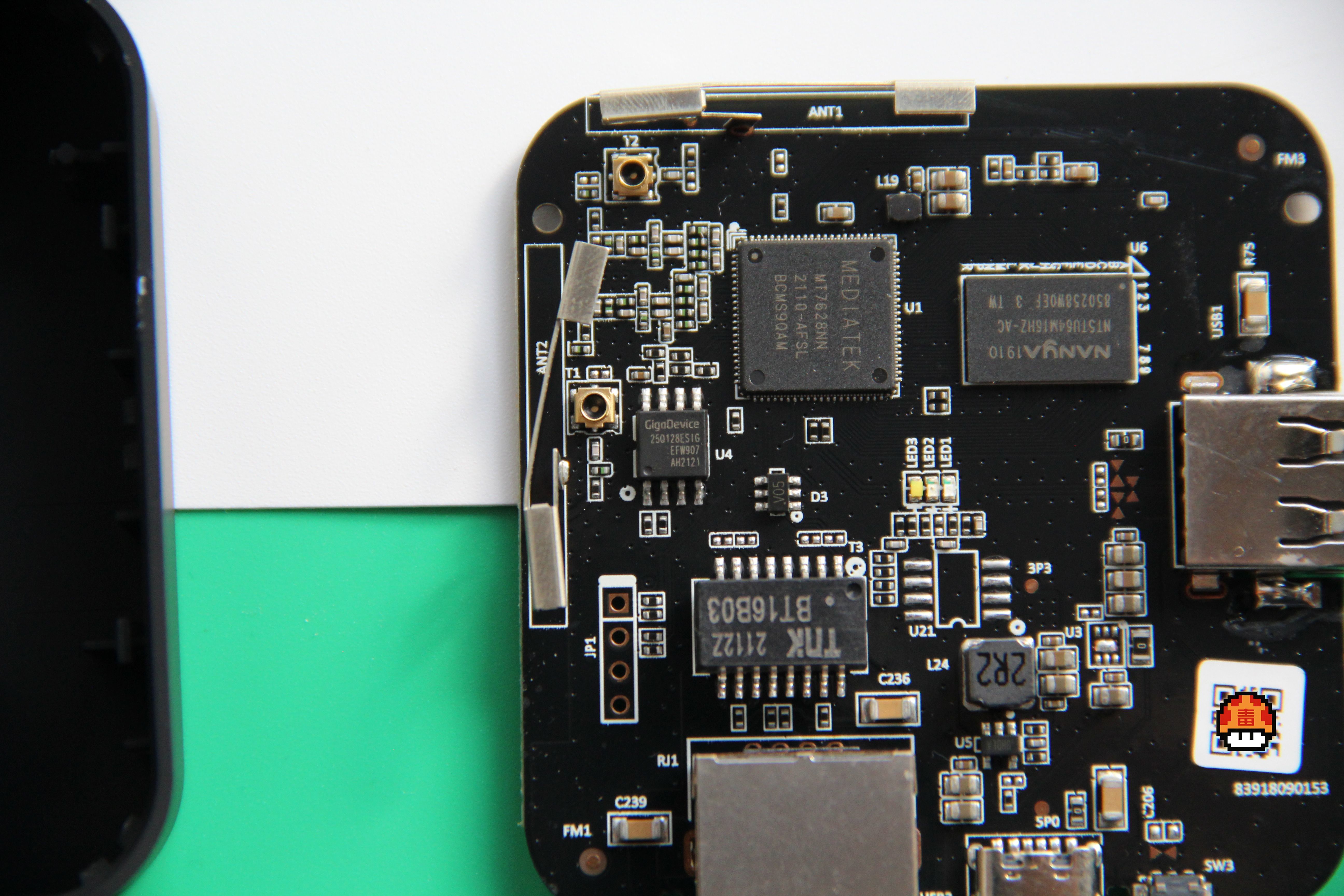 硬件配置一览。处理器为MT7628NN,运行内存为南亚NT5TU64M16HZ-AC,64Mb*16bank=1Gb=128MB的DDR2颗粒;闪存为兆易创新25Q128ESIG,容量16MB。网变BT16B03,内置两根铁皮天线,自带IPX接口可以扩展成外置。