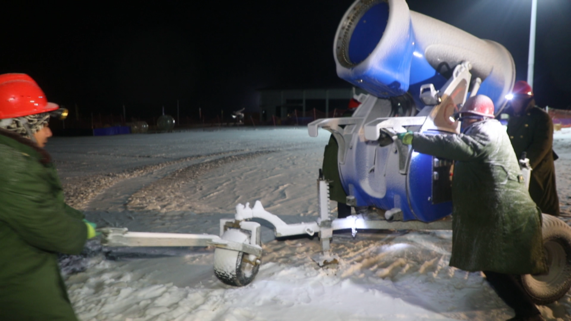 严寒里,烤水管的动作幅度不能太大。王兴龙和团队成员冻得连手指也不太听使唤了。随着汩汩水声,管道逐渐解冻,他们丝毫不敢停歇。因为,要造雪了。