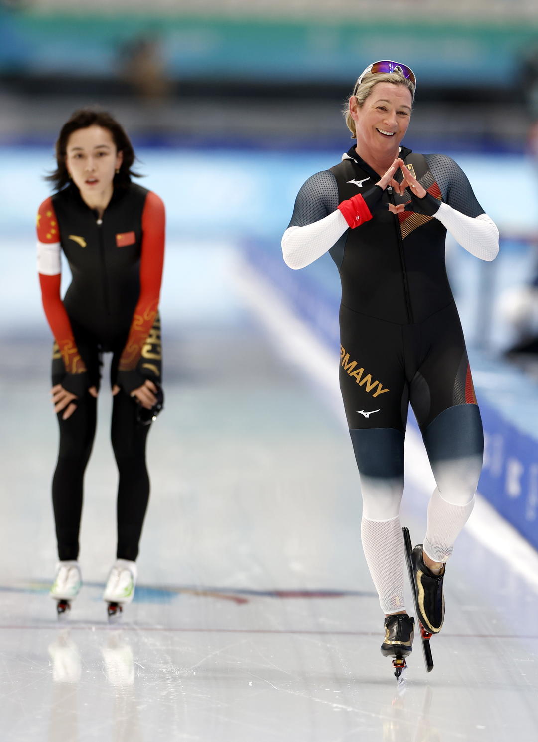 2月5日下午,北京冬奥会速度滑冰女子3000米比赛在国家速滑馆“冰丝带”进行。比赛的第一组竟然是一对“老少对决”:22岁的中国选手阿合娜尔·阿达克开始了自己的第一次奥运会征程;而她的对手,站在外道的德国选手克劳迪娅·佩希施泰因今年49岁,此前3分57秒70的奥运会纪录正是由她在2002年盐湖城冬奥会创造,这也是她的第八次冬奥会之旅。
