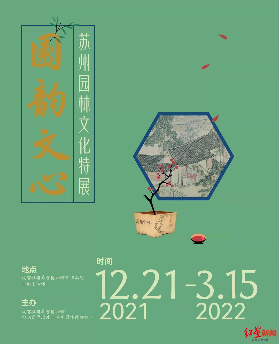 游客还可以参观由成都杜甫草堂博物馆联手苏州市拙政园管理处(苏州园林博物馆)策划的“园韵文心——苏州园林文化特展”。该展览分为“园之史”“园之观”“园之趣”三个板块,共计展出拙政园(苏州园林博物馆)所藏文化类精品实物近200件,如清代花窗、民国古盆、苏作家具、书画、刺绣、贡墨等多个种类。