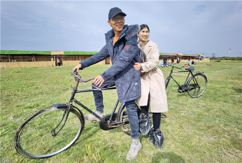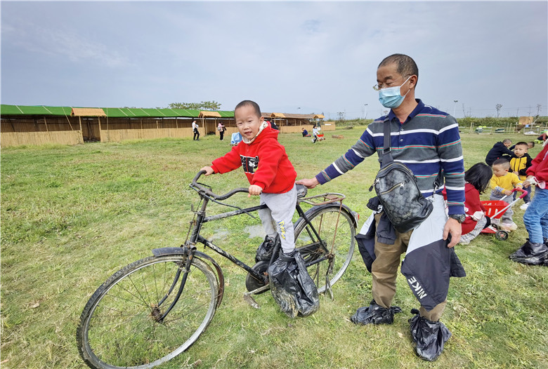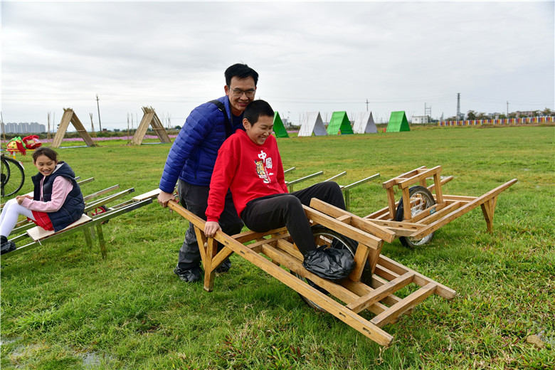 游客们在草地玩嗨了,根本停不下来。父亲用亲爹牛角车、鸡公车推孩子,推出一身汗水,父亲想停下来,孩子就是不肯亮红灯,要老爸再向前进;母亲用箩筐挑着孩子大步往前走,完整的怀旧版赶集;父亲将孩子扶止老式双杠单车,回到小时候自己的父亲在春节教自己骑自行车的幸福时光;踏碓做糍粑,推磨做豆腐,风车车谷这些乡村项目更让游客玩得乐不思归。