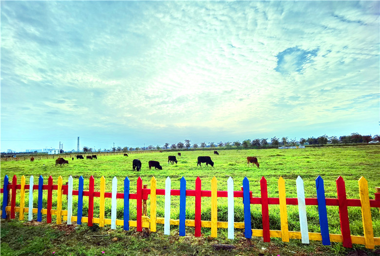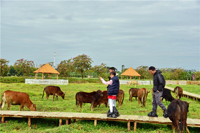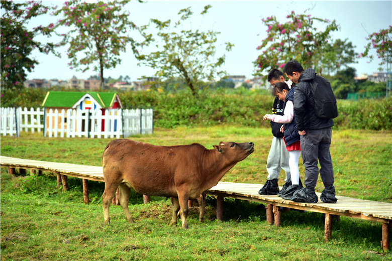 犇牛牧场拥有近百亩大草地,看起来就像一个南方版的大草原,春草肥美,牛羊成群在草地上悠闲地吃草,让人以为置身于蒙古大草原。牧场还专门设置了网红打卡牛棚,童话动物小屋,钻牛角尖、吹牛皮、对牛弹琴等体验项目。