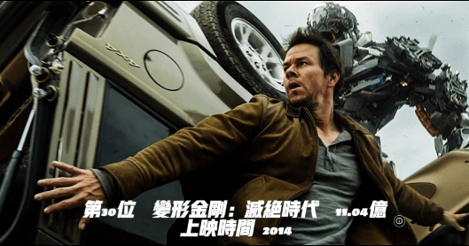 第30位:变形金刚-灭绝时代Transformers: Age of Extinction 票房:11.04亿美元