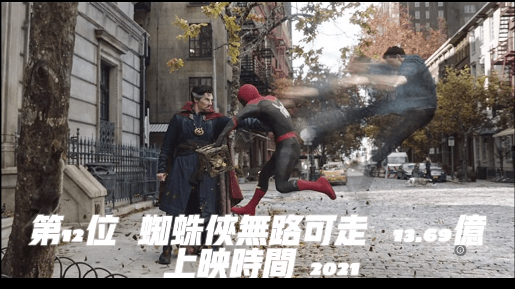 第12位:蜘蛛侠:无路可走 Spider-Man: No Way Home 票房:13.69亿美元 2021