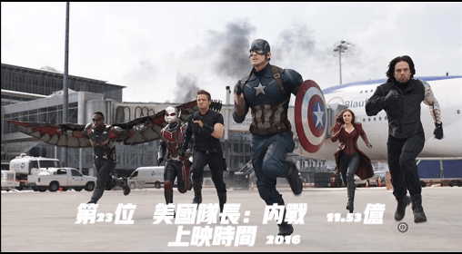 第23位:美国队长:内战 Captain America: Civil War 票房:11.53亿美元 2016