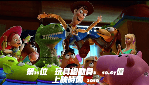 第35位:玩具总动员3 Toy Story 3 票房:10.67亿美元 上映时间:2010