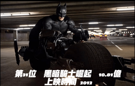 第31位: 黑暗骑士崛起 The Dark Knight Rises 票房:10.81亿美元 上映时间:2012