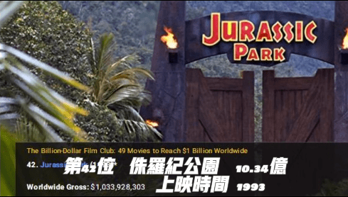 第42位:侏罗纪公园Jurassic Park 票房:10.34亿美元 上映时间:1993