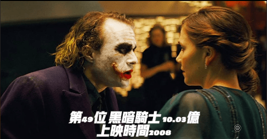 第49位:49 黑暗骑士 The Dark Knight 票房:10.03亿美元 上映时间:2008