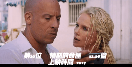 第20位:愤怒的命运 The Fate of the Furious 票房:12.36亿美元 上映时间:2017