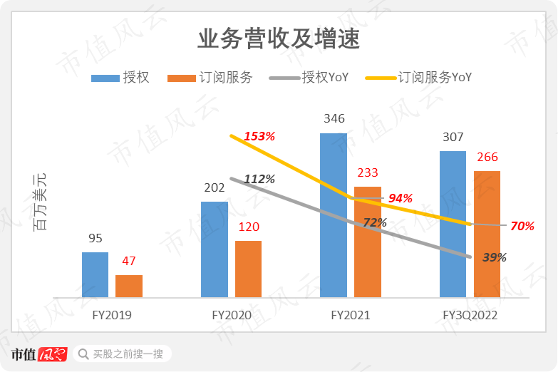 订阅服务收入近年来的营收增速一直高于授权收入。2022财年前三季度,订阅服务收入3.1亿美元,同比增长70%;授权收入2.7亿美元,同比增长39%。