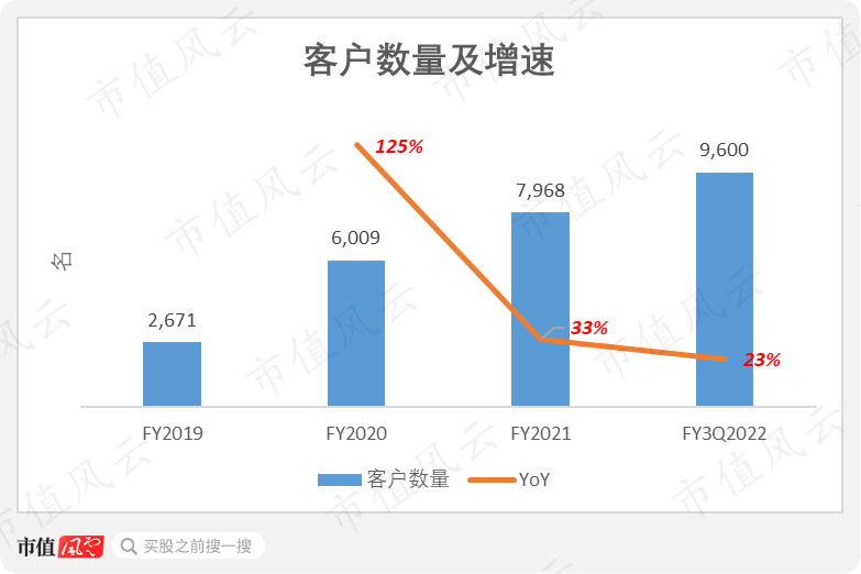 截至2022财年前三季度末,公司客户数量约9600名,同比增长23%。