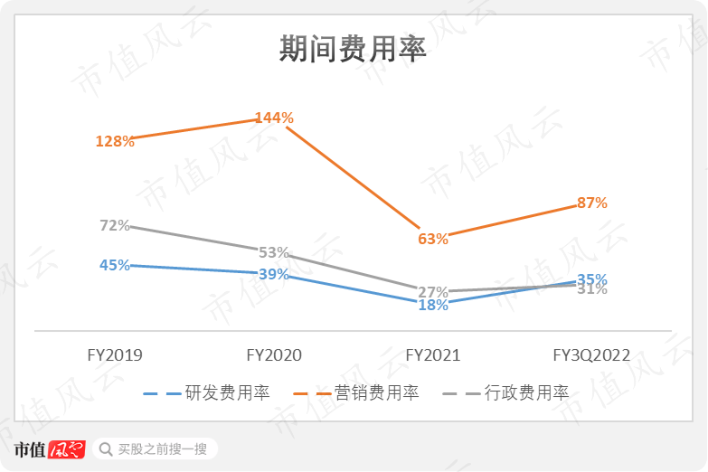 2022财年前三季度,公司营销费用率、研发费用率和行政费用率分别为87%、35%和31%。