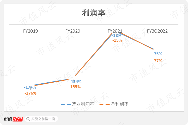 2022财年前三季度,公司营业利润率和净利润率分别为-75%和-77%,均较去年同期下滑逾40个百分点。