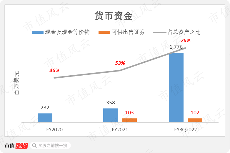 在上市募集了13亿美元资金后,公司账面上的现金及现金等价物截至2022财年三季度末已经高达18亿美元,加上1亿美元的可供出售证券,公司的流动资金合计占到总资产的76%。