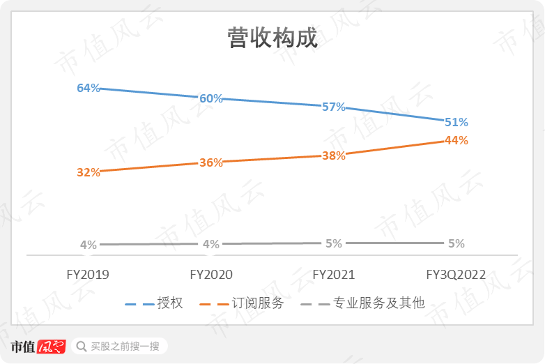 2022财年前三季度(注:截至2021年10月31日),授权收入和订阅服务收入分别占公司营收的51%和44%。