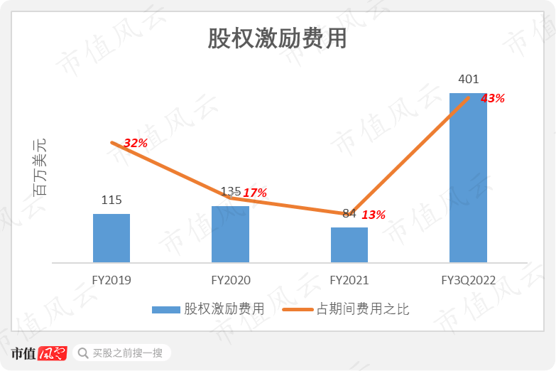 当期,计入营销费用、研发费用和行政费用的股权激励费用达到4亿美元,占到期间费用的40%。