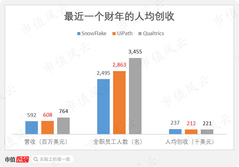 在各自的最近一个财年,公司的人均创收(营业收入/全职员工人数)最低,为21万美元,而Snowflake和Qualtrics的人均创收分别为24万美元和22万美元。