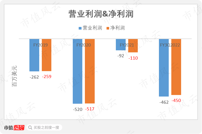 2021财年,公司营业亏损和净亏损较此前两个财年明显缩小;2022财年前三季度,盈利状况又出现恶化,同期营业亏损和净亏损分别为4.6亿美元和4.5亿美元。