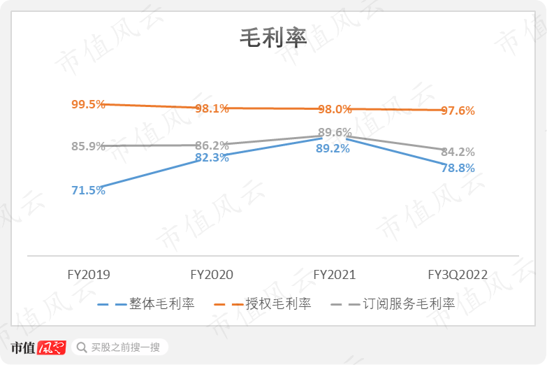 过去三个财年,公司整体毛利率一路攀升,2021财年达到89%。然而,2022财年前三季度,整体毛利率下滑至79%。为什么呢?