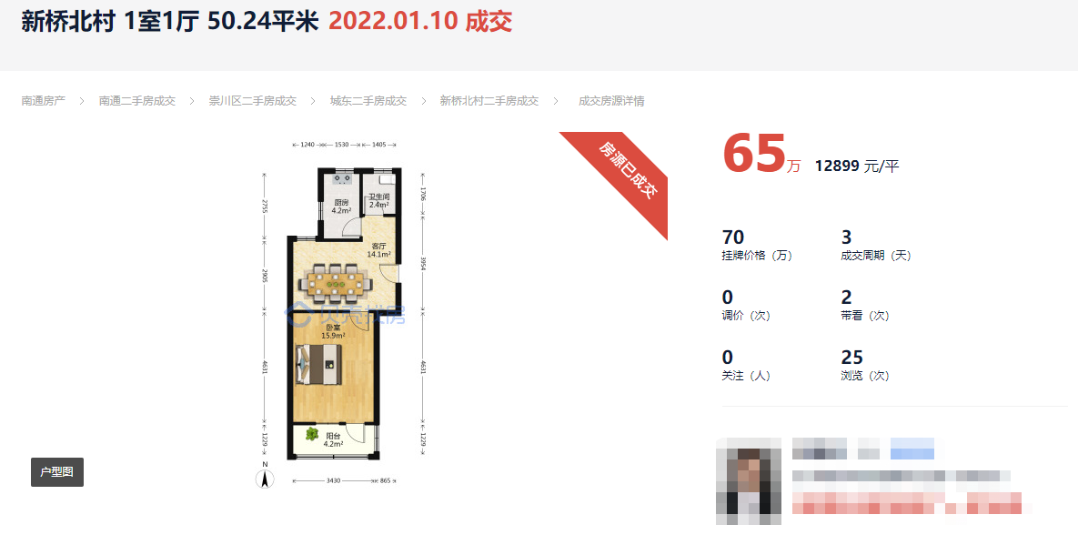 新桥北村50.24㎡房源挂牌3天成交,成交总价低于挂牌价5万,成交单价12899元/㎡。