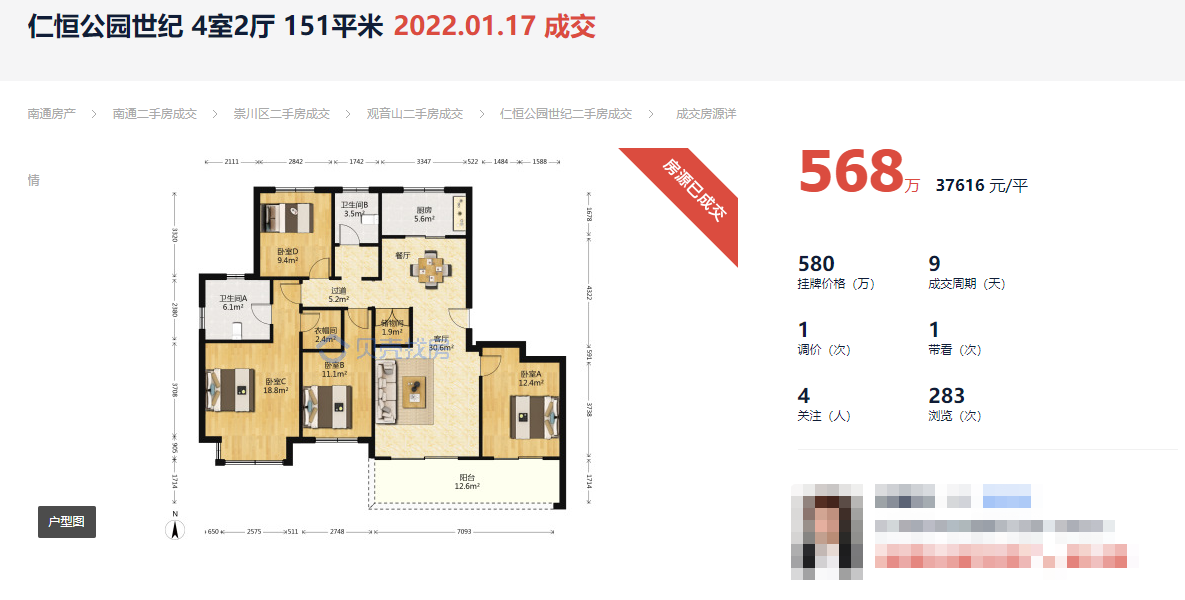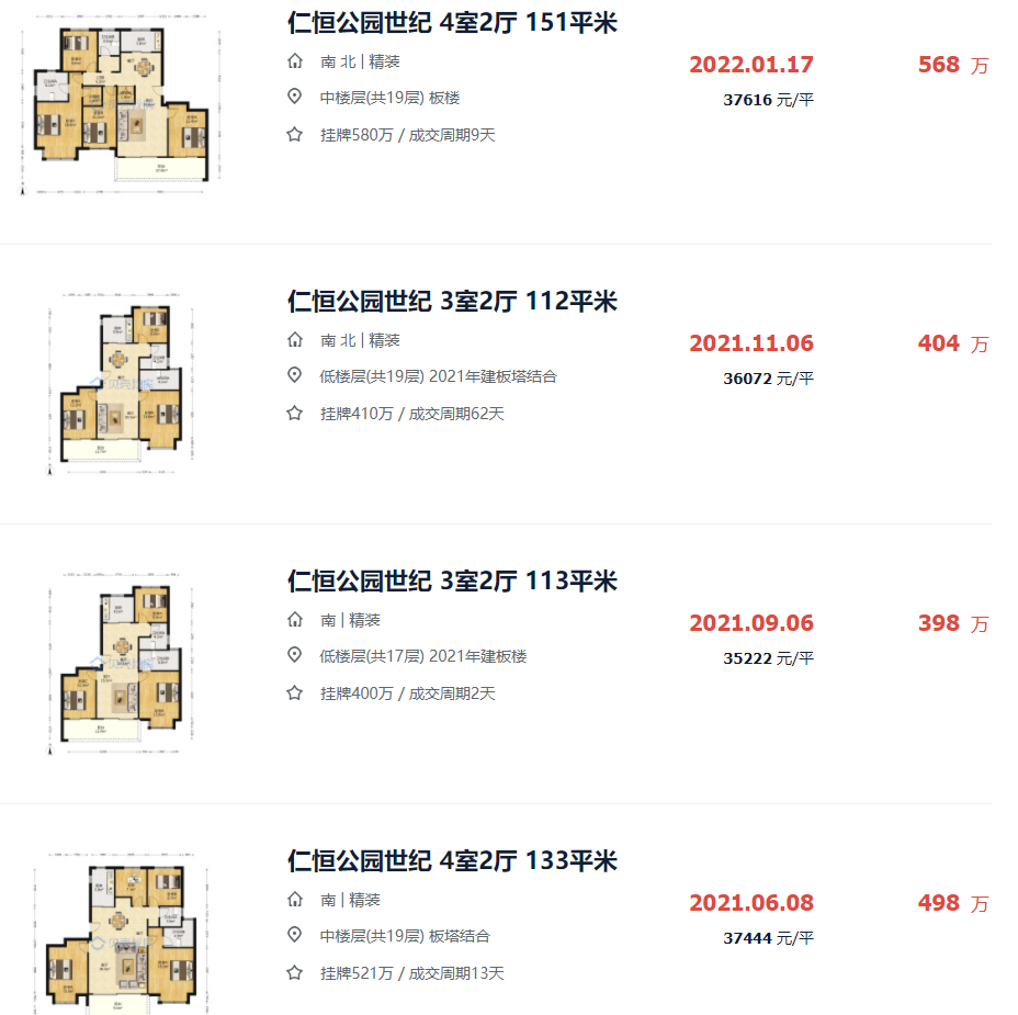 值得一提的是,仁恒公园世纪151㎡房源挂牌9天达成交易,成交单价37616元/㎡,成交总价568万,比挂牌价低12万。