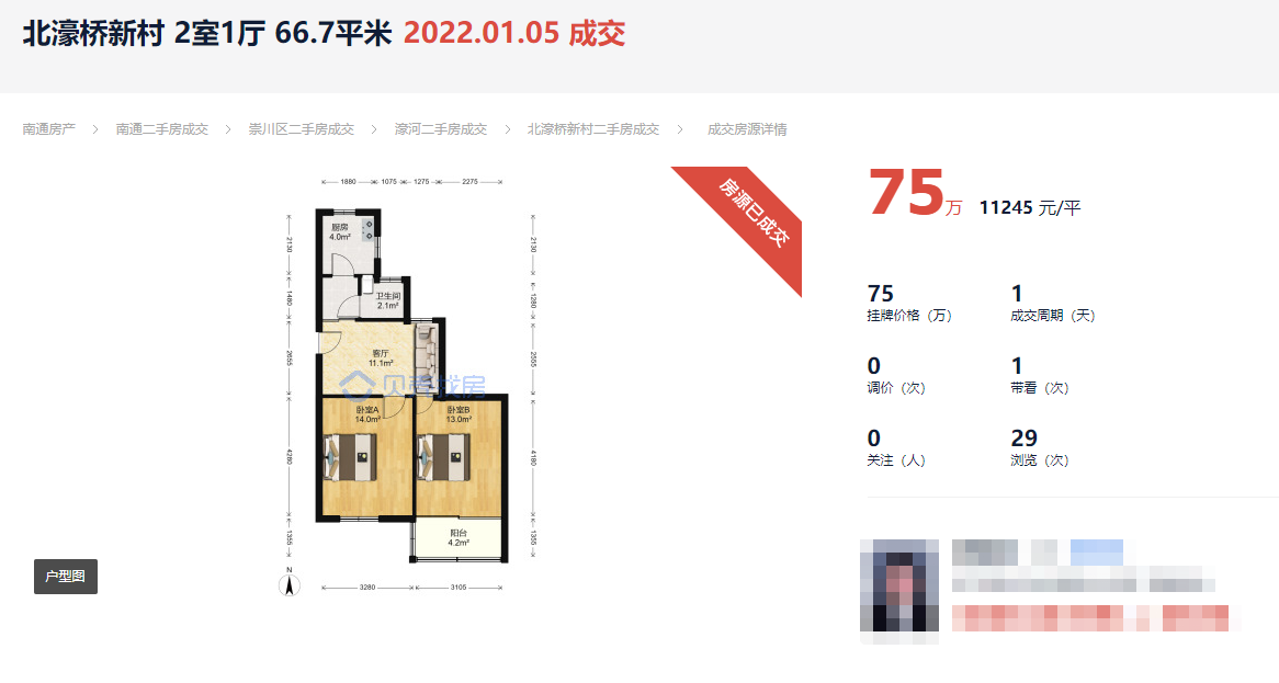 北濠桥新村66.7㎡房源挂牌1天达成交易,挂牌价即成交价,成交单价11245元/㎡。