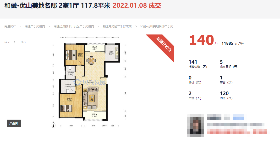和融优山美地名邸117.8㎡房源挂牌5天成交,成交价仅比挂牌价低1万,成交单价11885元/㎡。