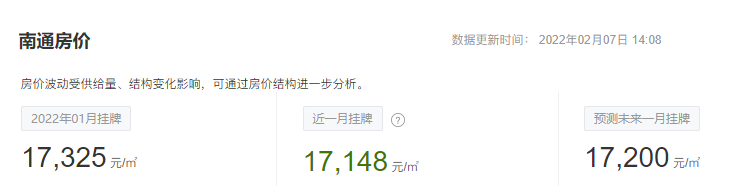 据中国房价行情网显示,近一个月南通出售二手房挂牌均价为17148元/㎡,环比下跌。