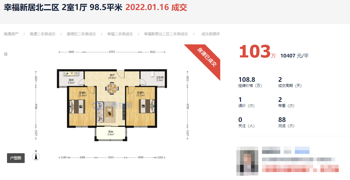 幸福新居北二区98.5㎡房源挂牌2天成交,成交总价103万,比挂牌价低5.8万,成交单价10407元/㎡。