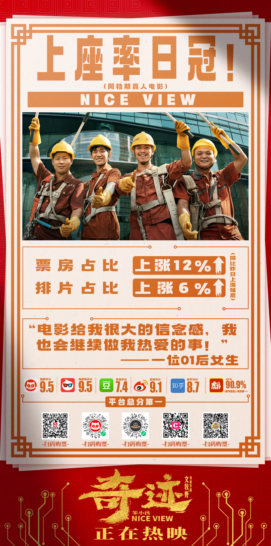 《奇迹·笨小孩》上映第七天获得同档期真人电影上座率日冠,相比昨日票房占比上涨12%,排片占比上涨6%,全平台口碑总分稳居首位。截止目前累计票房超7.5亿,并首发“集结曲”《呜呜呜》,声音碎片乐队通过干净透彻的歌声,唱出片中“奇迹小队”的成员们紧密集结,即使面对生活的困苦与创业的艰难,依旧团结一心、携手共进的奋斗精神。而长春站“幸福之力”的路演现场,也有影迷向文牧野导演表示:“影片中最感动的就是奇迹小队每个人都没有忘记自己的初心,遇到各种风险挑战都能迎难而上,勇敢追逐心中的光,非常感谢文导给在新年之初带给我们这样一部电影,在我比较困难的阶段给我力量。”