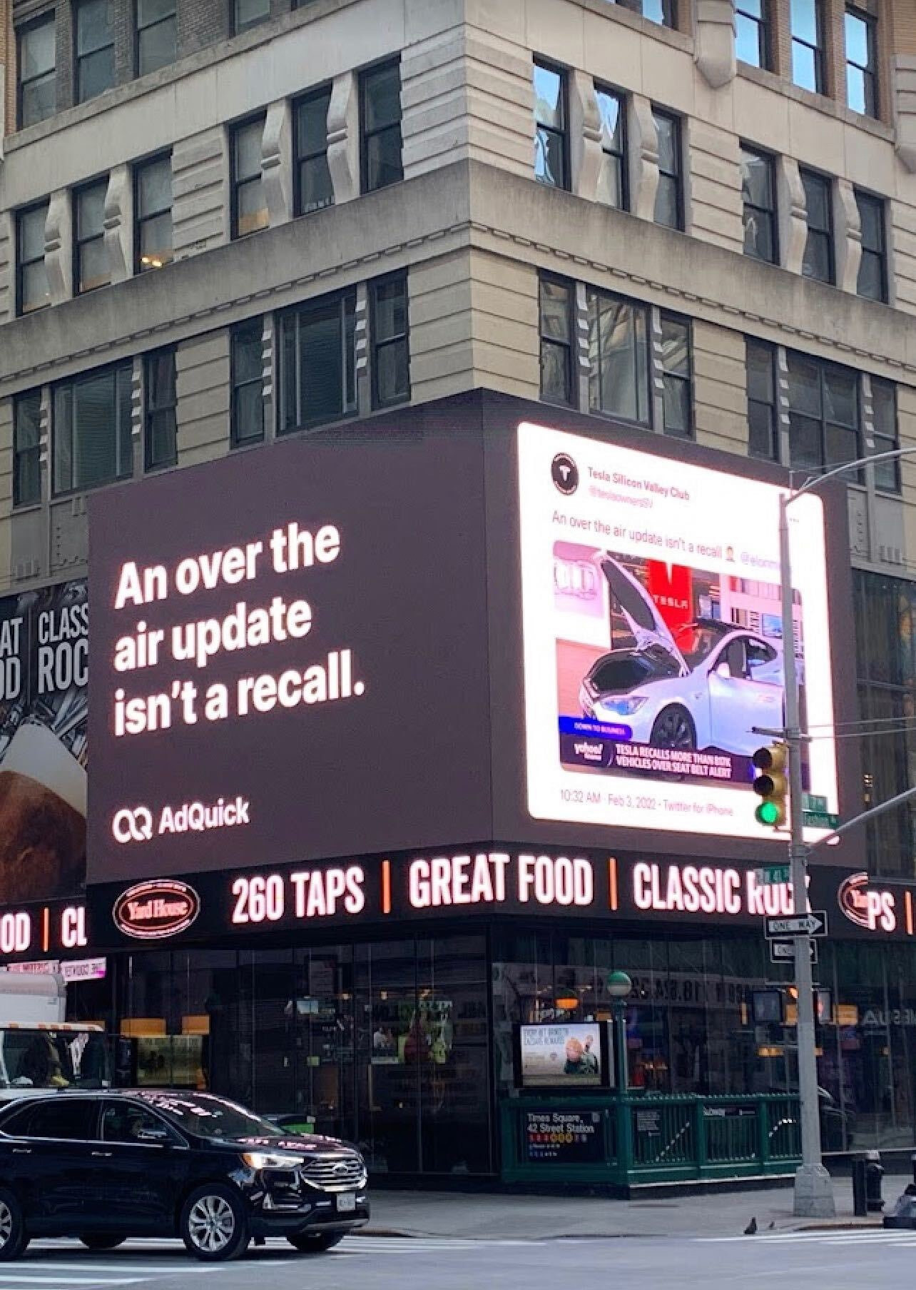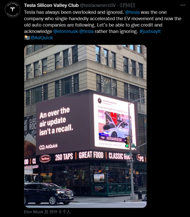 对于此次召回,特斯拉并未给出相关回应。然而,有特斯拉的粉丝在纽约时代广场买下了广告位,贴出了一个来自“特斯拉硅谷俱乐部”的推文,并在旁边写下大大的“OTA 升级不是召回”字样。
