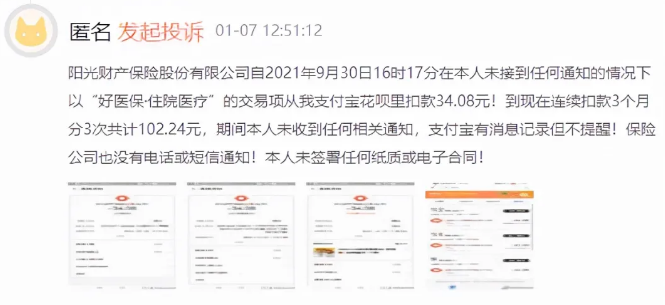 “阳光财产保险股份有限公司自2021年9月30日16时17分在本人未接到任何通知的情况下以‘好医保·住院医疗’的交易项从我支付宝花呗里扣款34.08元!到现在已经连续扣款3个月,共计102.24元。期间本人未收到任何相关通知。支付宝有消息记录但不提醒!保险公司也没有电话或短信通知!本人未签署任何纸质版或电子合同!”一名消费者自述。
