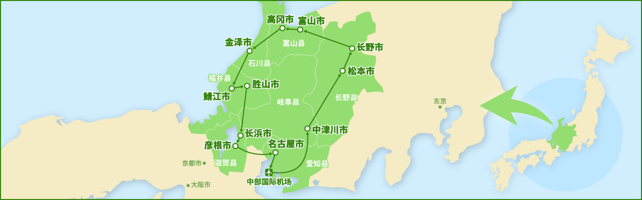 位于日本本岛中央的中部地区,是由爱知县、静冈县、长野县和三重县等全6县组成,是能够感受到雄伟自然的区域。此外,丰富的世界文化遗产、从中山道留存至今的古老街景、用在地食材制作而成的美食,都在还原着中部地区独特的老味道。每一处都让人惊喜,每一天都充满感动。