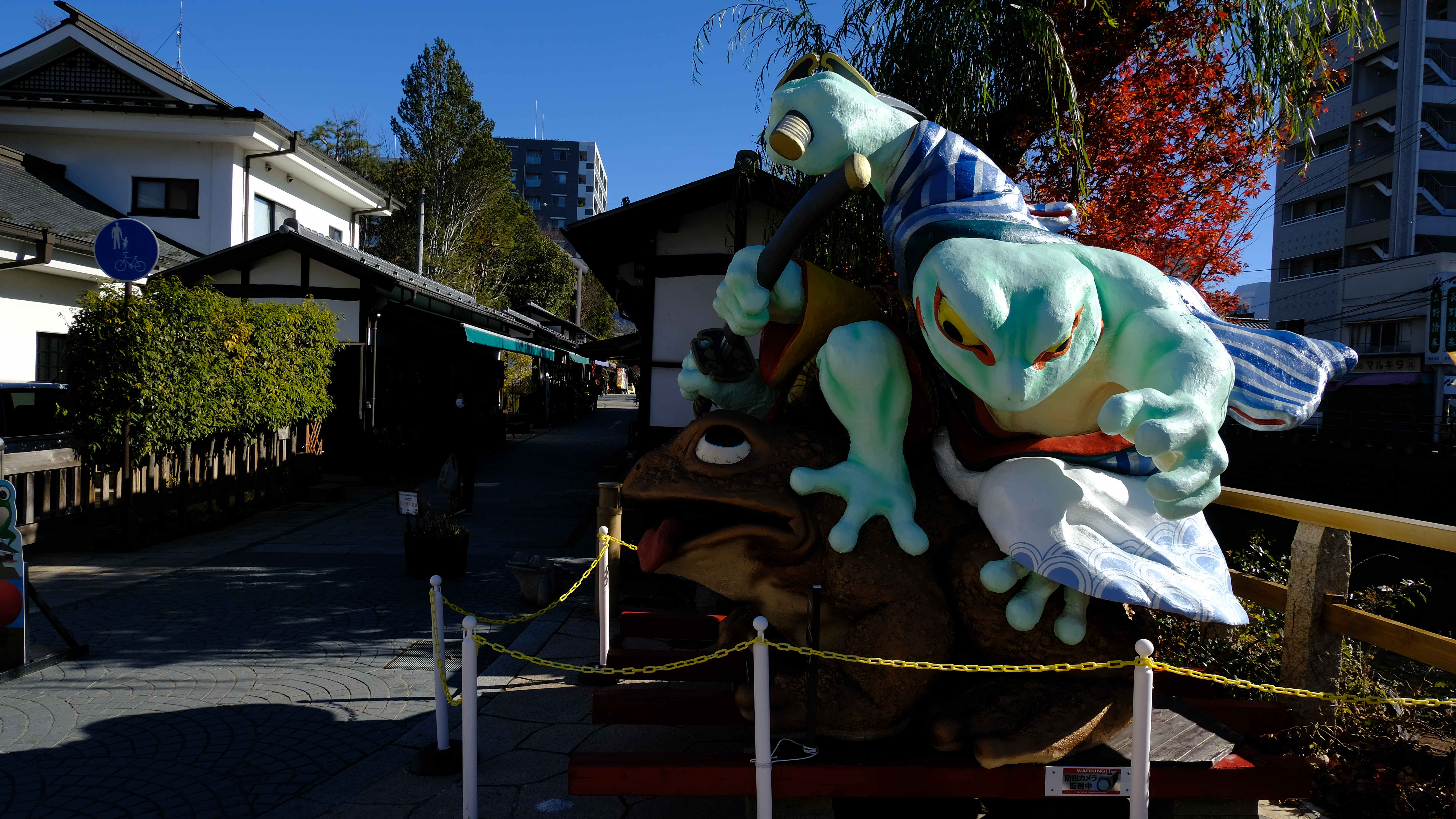 松本城下的绳手街是松本著名的商店街,由于位于松本城护城河旁边,这是一条商店街,独特商店像长屋一样一字排开。从女鸟羽川河岸开始的街道,因“像绳子一样的长堤”而被称为“绳手”。这里有很多关于青蛙的商店、手信、工艺品、雕塑等,甚至还有个青蛙神社,非常可爱。