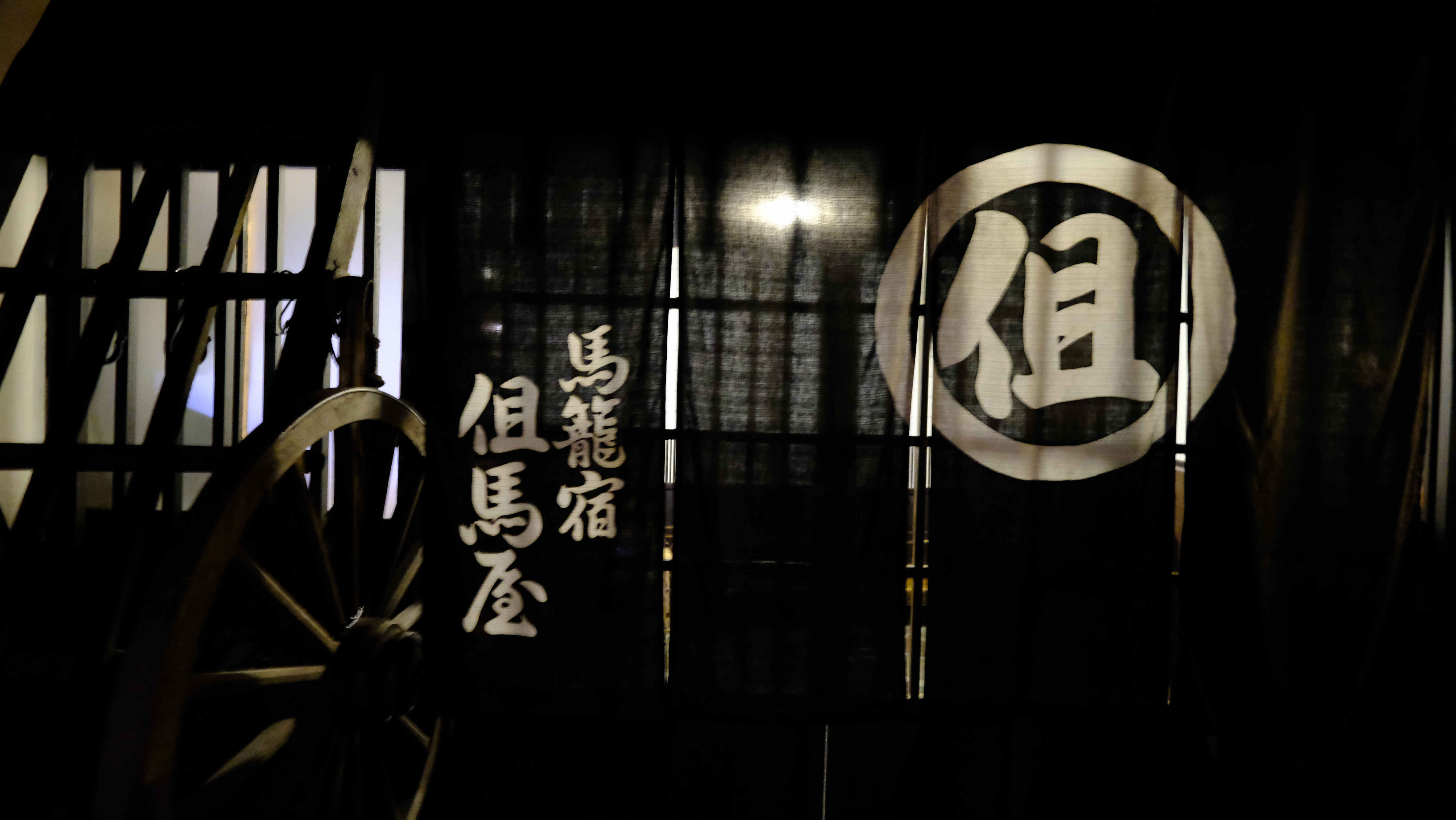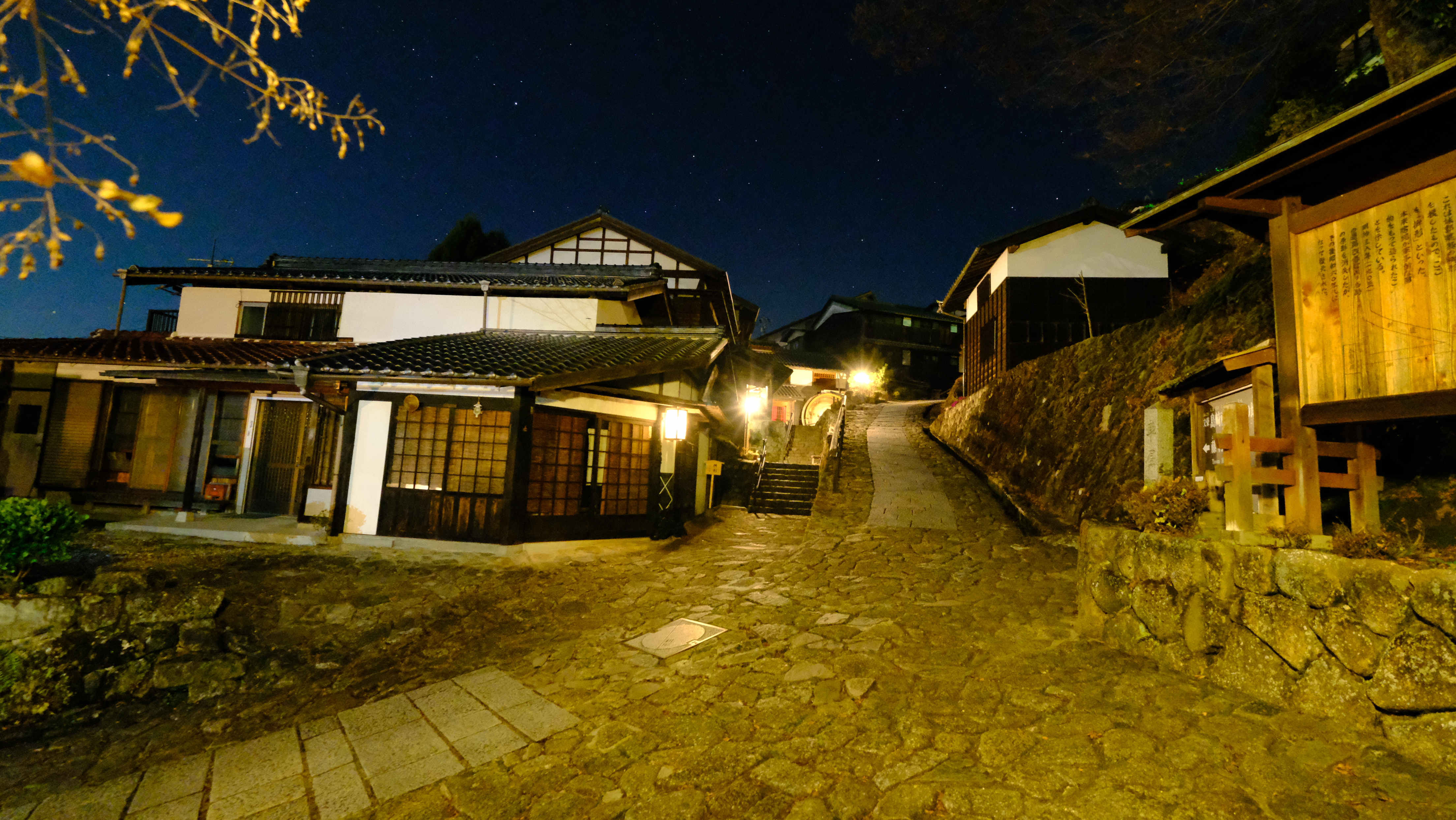 在马笼宿,大多只在白天观光,入夜后的街道空无一人。即使是观光咨询所,到了晚上也是一片漆黑。吃完晚饭想去小街上散散步,呼吸一下新鲜空气,才发现夜晚也有它独特的美。各家的门灯映在石阶上,周围只有流水声,星星也渐渐崭露头角,闪着浪漫的光,让我这个异乡人,能在此刻独占寂静的夜,突然感觉很是幸福。