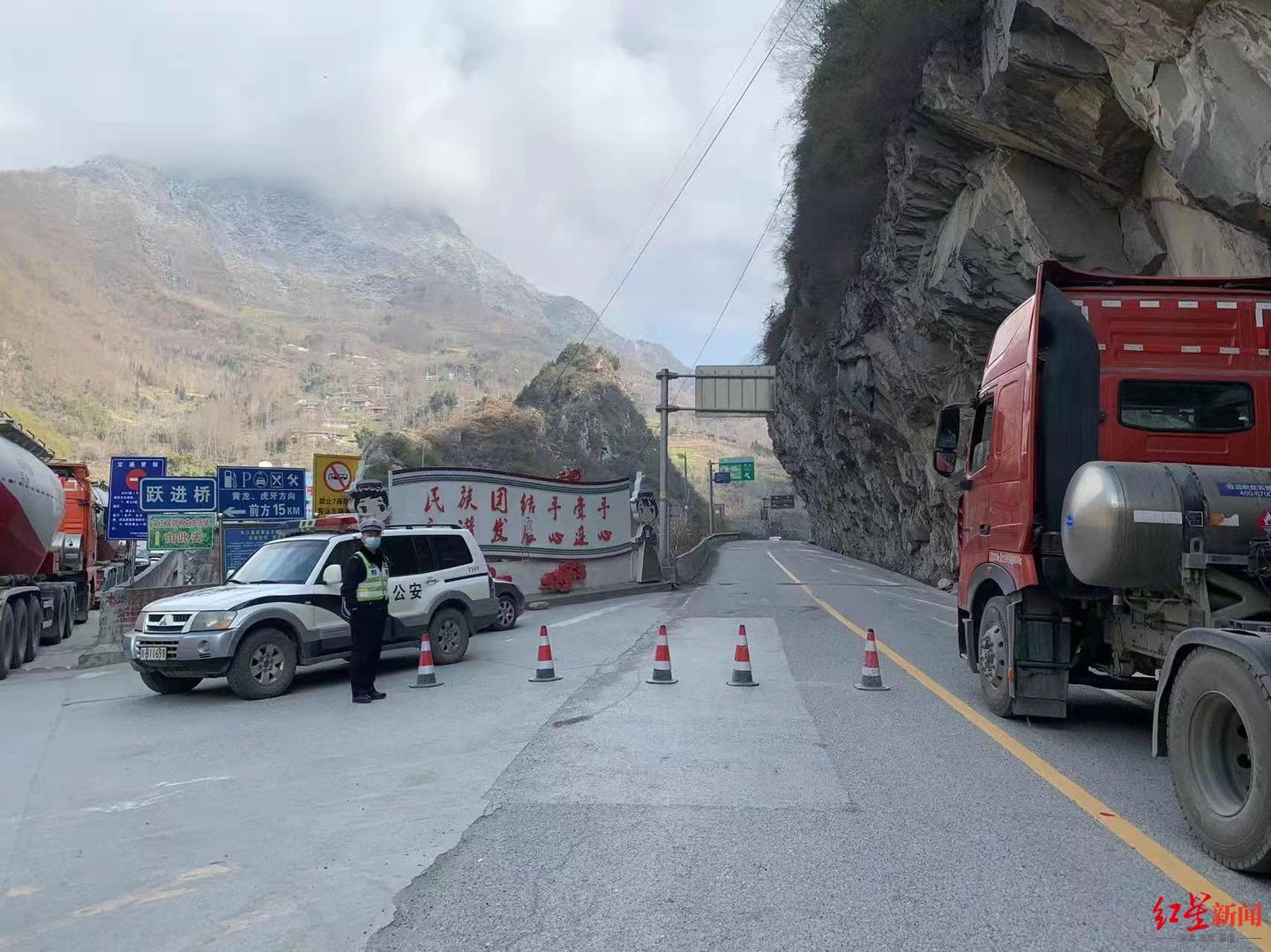 ↑交警已对该路段实行临时交通管制