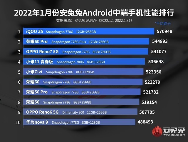 榜单第二名荣耀60 Pro首发搭载了骁龙778G Plus移动平台,基本可以看做是骁龙778G的“高频版”,整体表现也是相当不错的。榜单其它机型这里就不再赘述,小米Civi以523356分的成绩排在榜单第5。