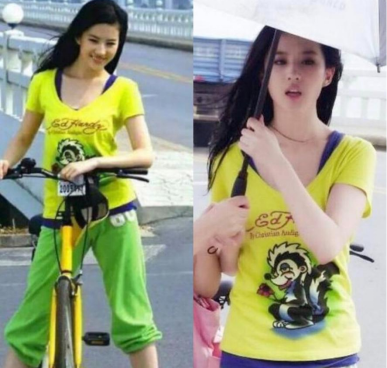 现在街上估计已经看不见这种衣服了,黄色的T恤,绿色的休闲裤,没想到这样“精神小妹”的风格,刘亦菲穿上还是美的。