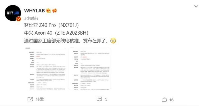 今日,数码博主@WHYLAB爆料,努比亚Z40 Pro(NX701J)、中兴Axon 40(ZTE A2023BH)两款骁龙8旗舰已经通过国家工信部无线电核准,这就意味着将很快发布。