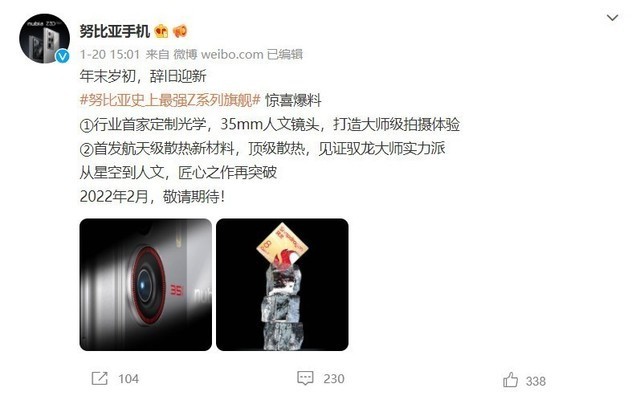 上个月,官方曾透露过努比亚Z40 Pro的一些信息,官微表示,努比亚史上最强Z系列旗舰惊喜爆料①行业首家定制光学,35mm人文镜头,打造大师级拍摄体验②首发航天级散热新材料,顶级散热,见证驭龙大师实力派。