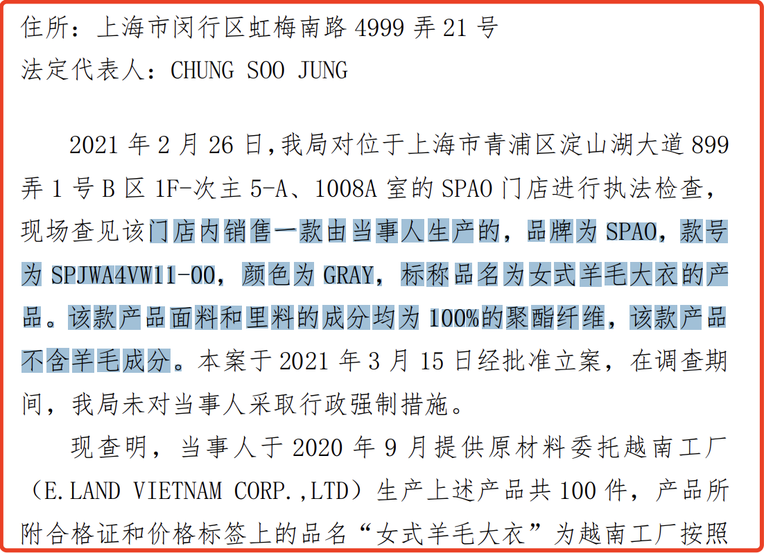 2020年11月12日至2021年2月26日期间,上述产品以女式羊毛大衣的名义通过上海市各SPAO门店共销售25件,库存75件。上海市市场监督管理局人味儿,ELAND生产销售上述不含羊毛成分的女式大衣,却在品名中加入“羊毛”二字,构成虚假宣传行为。