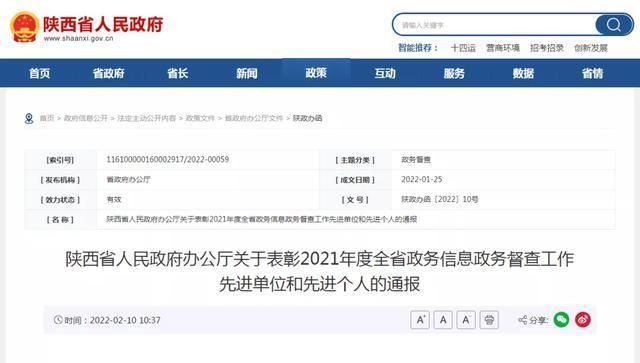 2月10日,陕西省人民政府网站发布《陕西省人民政府办公厅关于表彰2021年度全省政务信息政务督查工作先进单位和先进个人的通报》,对政务信息工作突出的西安市人民政府办公厅信息处等25个单位、强龙等50名个人,政务督查工作突出的西安市人民政府办公厅市政府督查室等25个单位、吕昭辉等50名个人予以通报表彰。具体如下: